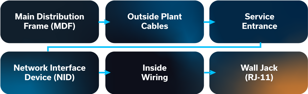 - Customer Premises: Includes the Network Interface Device (NID), internal wiring, and telephone endpoints.