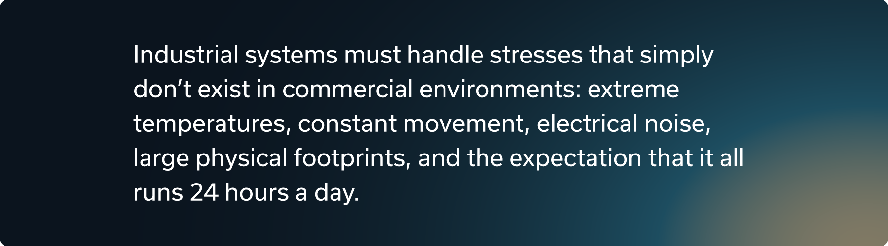 Industrial systems must handle stresses that simply don’t exist in commercial environments: extreme temperatures, constant movement, electrical noise, large physical footprints, and the expectation that it all runs 24 hours a day. Designing for that reality requires a different mindset and a different approach.