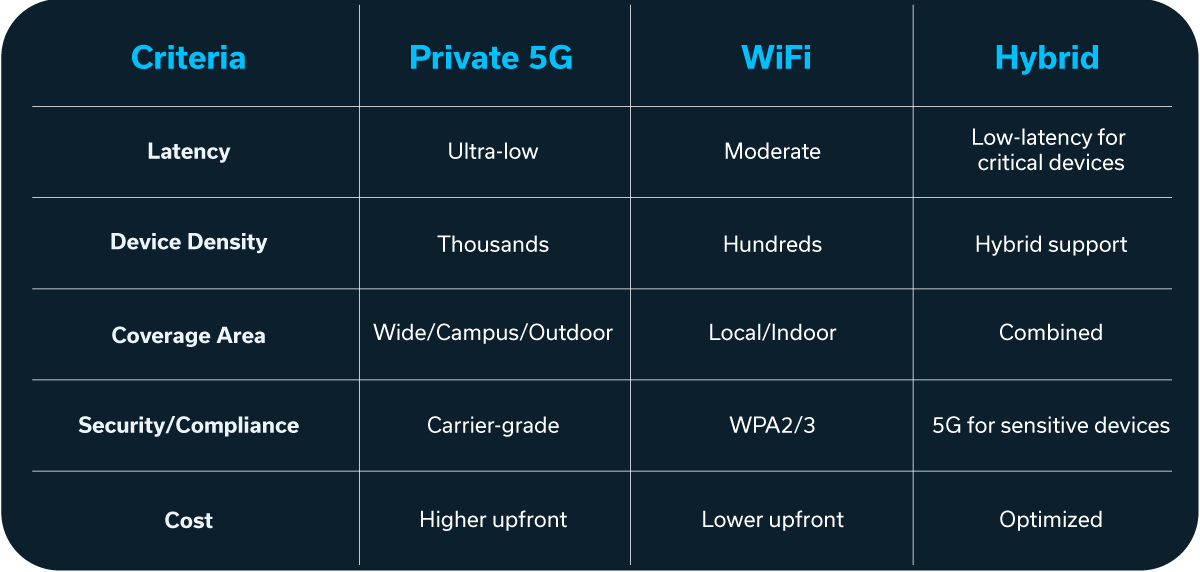 Alt Text: Chart comparing the criteria for Private 5G vs. Wi-Fi vs. Hybrid options for enterprises, including access method, mobility, coverage radius, security/compliance, and primary use.
