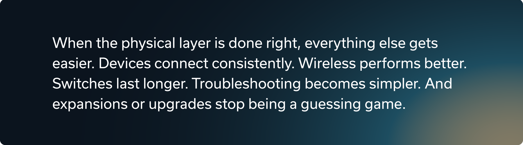 When the physical layer is done right, everything else gets easier. Devices connect consistently. Wireless performs better. Switches last longer. Troubleshooting becomes simpler. And expansions or upgrades stop being a guessing game.