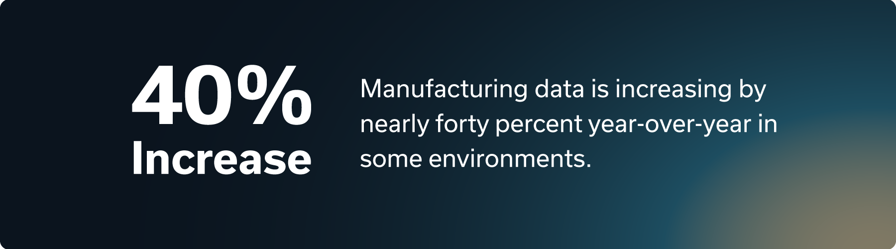 One of the most dramatic shifts happening right now is the amount of data produced by machines. Industry research and frontline experience both show that manufacturing data is increasing by nearly forty percent year-over-year in some environments.